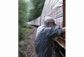 32. End of the line for us. That is a locomotive in the distance. Scott walking the rails